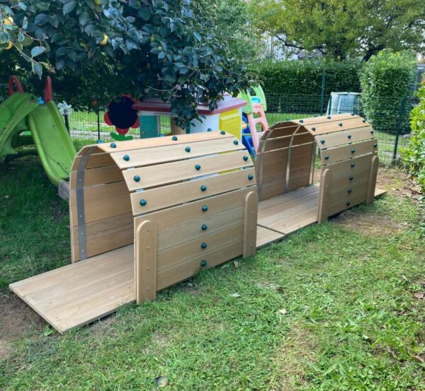 Gioco tunnel realizzato con doghe in WPC Wood Plastic Composite, un materiale innovativo e sostenibile che combina fibre di legno riciclato e polimeri, 100% MADE IN ITALY. Il WPC è noto per la sua resistenza agli agenti atmosferici, garantendo una lunga durata senza richiedere trattamenti o verniciature periodiche.